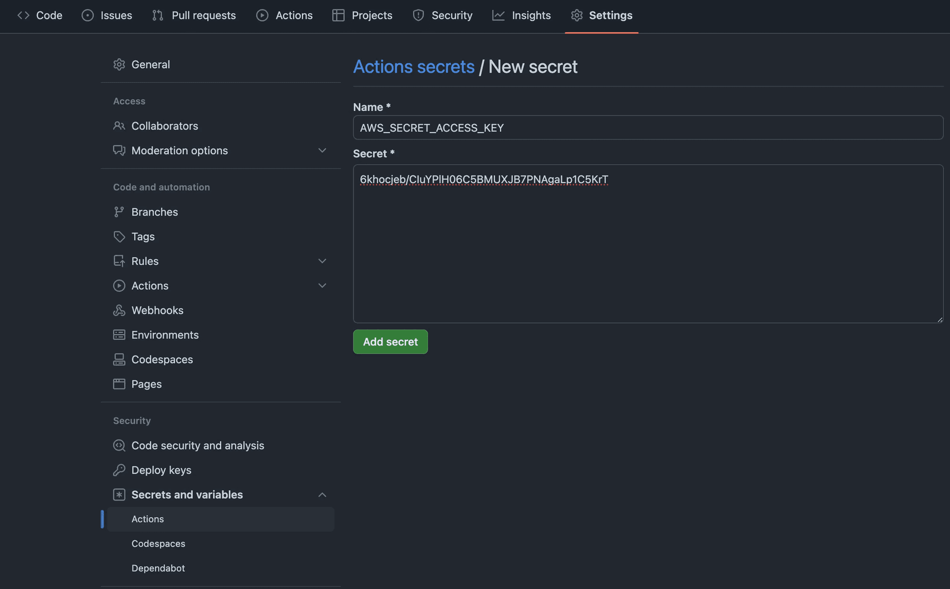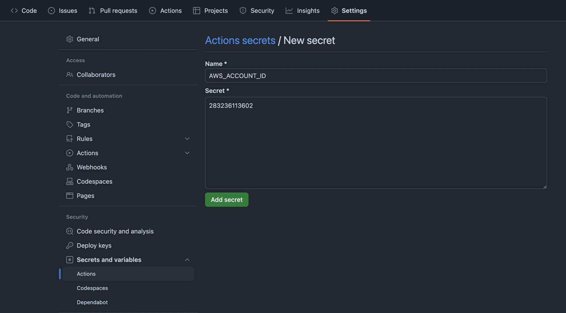 First, let's add all the required environment variables obtained in the AWS steps above to your GitHub repo as repository Secrets. Go to your GitHub repository's Settings, and click on Secrets and Variables. Then, click on New repository secret.