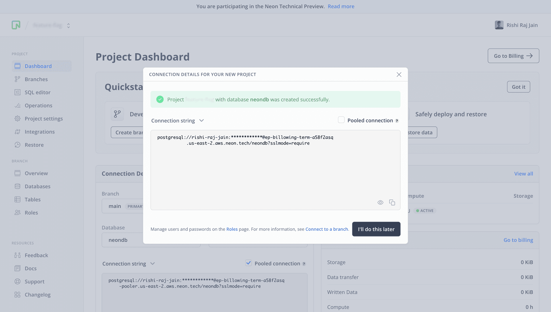 Save this connecting string somewhere safe to be used as the DATABASE_URL further in the guide. Proceed further in this guide to create a Node.js application.