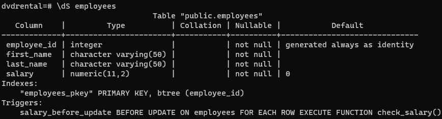 RENAME TO salary_before_update;If you use psql tool, you can view all triggers associated with a table using the \dS command: